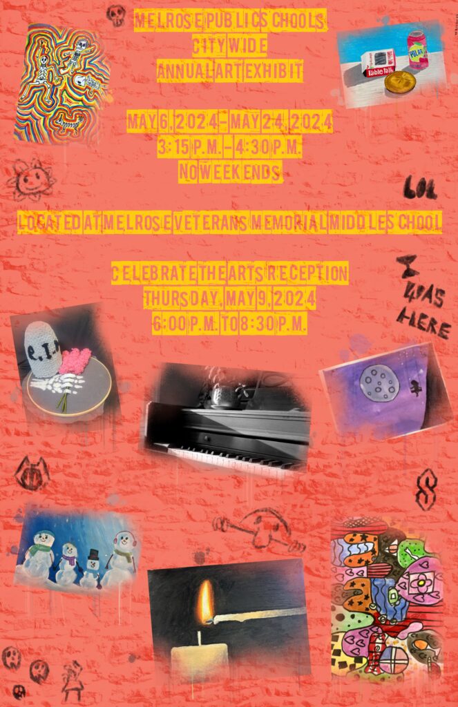 The opening Celebrate the Arts reception is on May 9, from 6:00-8:30 PM at Melrose Veterans Memorial Middle School. The event is free and open to the public. The art exhibit will be on display from May 6- May 24 from 3:15-4:30 p.m. excluding weekends.