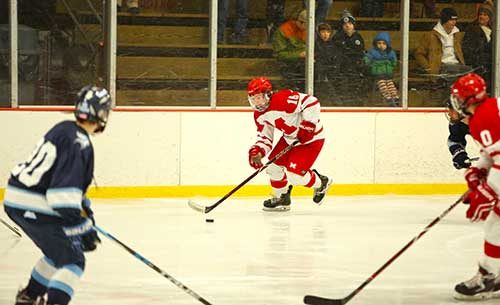 THE MELROSE Red Raider hockey team upset Winchester, 4-0 to earn their 10th win of the season. Pictured is Kevin O’Keefe. (Donna Larsson photo)