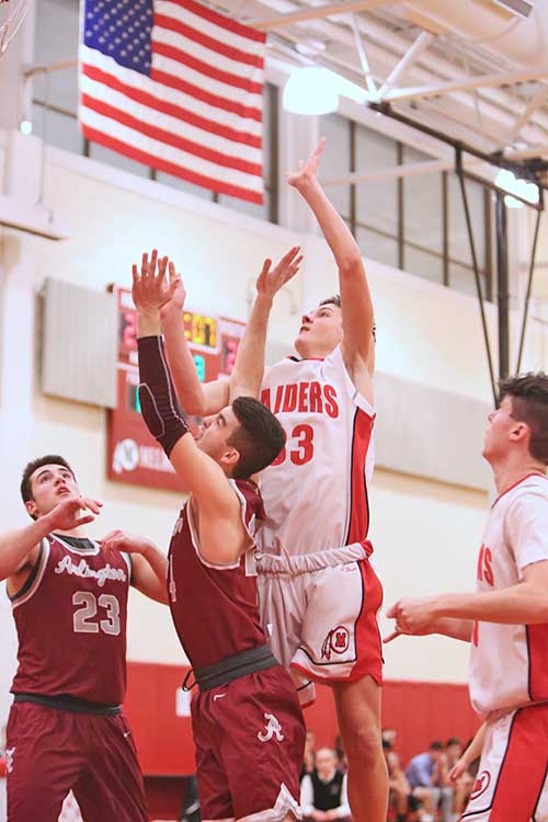 The Red Raiders were led in scoring by freshman Holden Symonds with 17 points and senior Luka Vlajkovic with 14. It was a tough defensive battle for most of the contest, with Melrose holding several leads until a free-wheeling fourth period when both teams scored a combined 36 points, but the Spy Ponders tiptoed away behind three-pointers from Myles Hess and the tough presence of Jhalani Joshua under the hoop. Leading in scoring for the Spy Ponders was sophomore Brendan McNamara with a whopping 28 points.