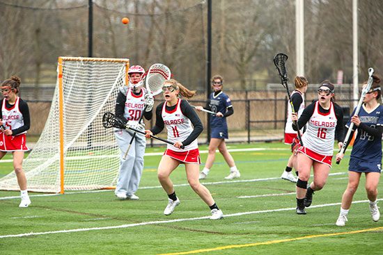 MELROSE—The Melrose High girl’s lacrosse team pulled off a 14-13 come-from-behind victory over Arlington on Thursday, April 11 at AHS Pierce Turf in Arlington, for their first win of the season.