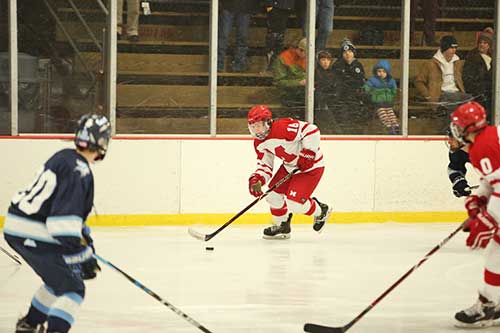 IT’S TOURNEY time for the Melrose Red Raider hockey team, who qualified with a win over Belmont and a 3-3 tie with St. John’s Prep. Pictured is Red Raider Kevin O’Keefe. (Donna Larsson photo)