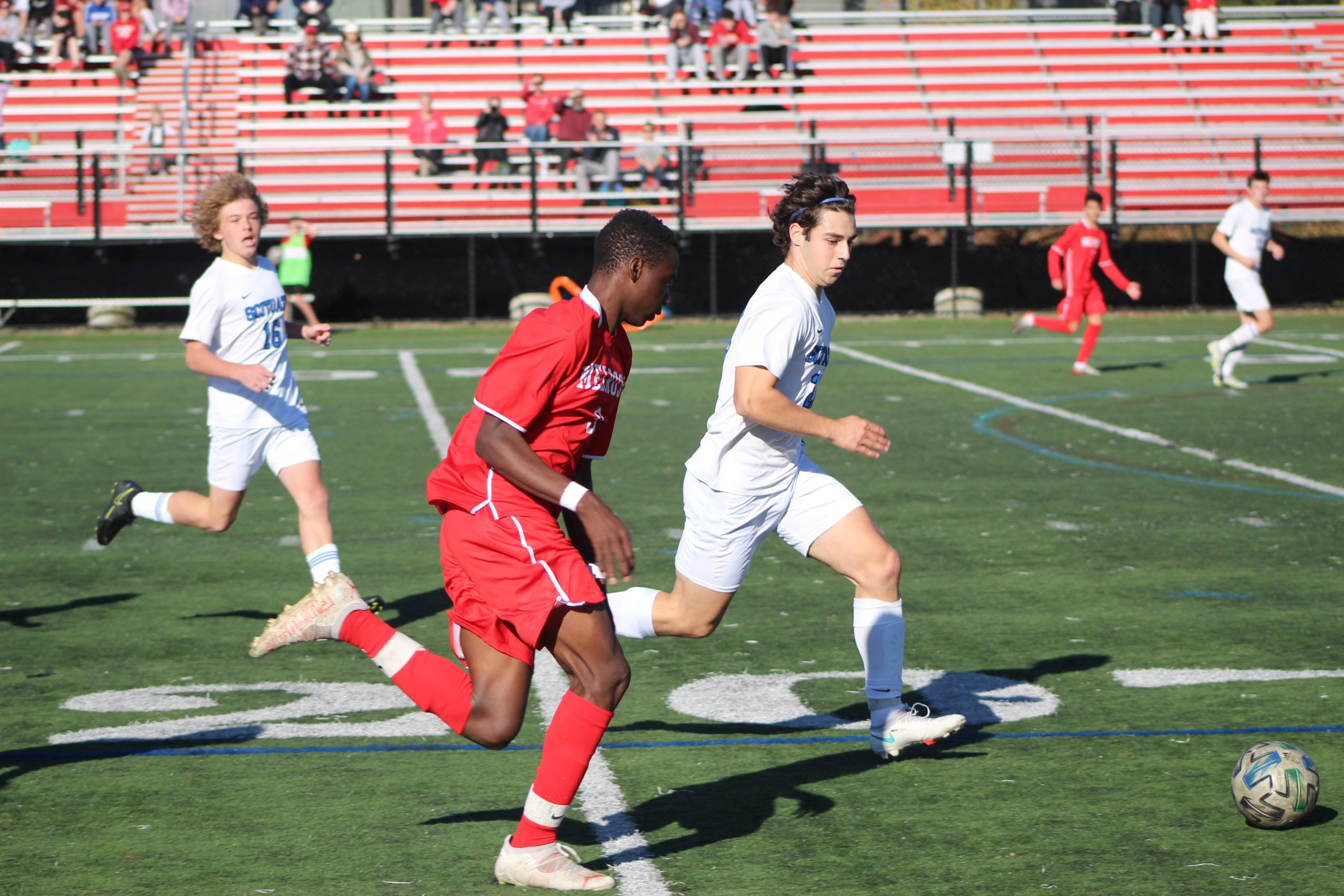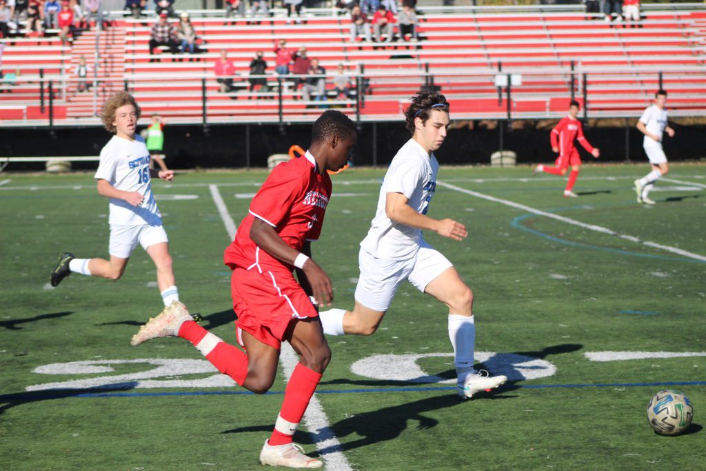 Scituate’s Alex Christiansen scored the game’s only goal just minutes after the start, and it was a score that Melrose could not recover from, despite maintaining most of the ball in the first half. Melrose standout Parker Thornton had several shots at net but fell just shy several times. Players Jovan Ssebugwawo and Amir Lahkiky also came close to finding the net, but Scituate goalies Ryan McGurty and Cole Brundige were stingy and ultimately both earned the shutout at the net. Melrose remained a threat during the game though as middies Joey Beshel and Liam O’Hara were key in keeping the ball out of Sailor territory as Melrose attempted to tie it up.