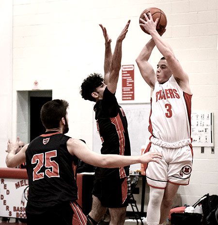 Borstel kicked things off with a three-pointer to start the game, followed by another three by Melrose’s Brandon McSorley that gave the Red Raiders a quick lead of 7-5. Watertown went to the foul line several times and made Melrose pay, hitting every shot and taking a brief lead of 11-10 at the end of the first. The teams traded ties at 13 before Vlajkovic opened things up with back-to-back baskets that drew fouls and gave Melrose a lead of 18-16. Another Borstel three put Melrose up 21-19 lead at halftime.