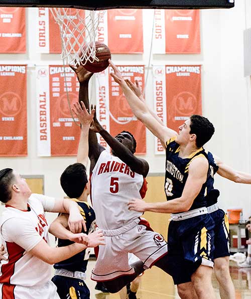 Though outsized by Lexington, Melrose stormed out of the gate and led 26-18 at the half behind offensive efforts from Melrose senior Anthony Colozzo (7 points, 3 assists) and senior Frantz Pierrot (6 points, 8 rebounds). Charlie Stanton also was key on the foul line.