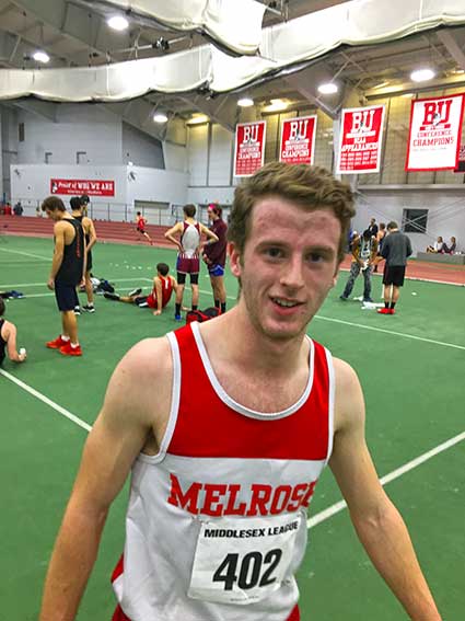 First place finishes included: Liam Rittenburg in the 600, a 1-2 sweep by Will Dugan and Matt Stockwell, respectively, a first place finish by the 4×200 relay team of Nate Monges, Fabrice Francois, Jesse Gardener and Alex Brincherio. Melrose also swept the 55 hurdles behind Liam Rittenburg, Brendan Ingalls and Jesse Gardener. Melrose also collected points behind the efforts of Nate Monges (second in the 55 dash) Charles DeMayo and Jerry Murphy in the 1 mile (2nd and 3rd), Ethan Brodeur, third in the 600 and Jimmy Markhan (2nd in the 300).