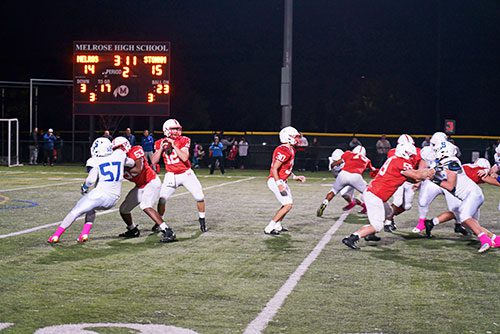With five minutes to halftime, Stoneham’s Chase found the end zone and a 2 point conversion made it a 15-14 game. Melrose was forced to punt on their next possession but took advantage of a fumble recovered by Brendan Maher, who had a terrific game with two critical pass completions over the night. Melrose went scoreless and went into halftime still down 15-14. After the half, Melrose endured a very questionable call with roughing the kicker penalty that rewarded Stoneham first down when they missed the ball punting. What followed was a clock-draining 16-down series led by Chase that resulted in a touchdown for Stoneham and a lead of 21-14 in the fourth.