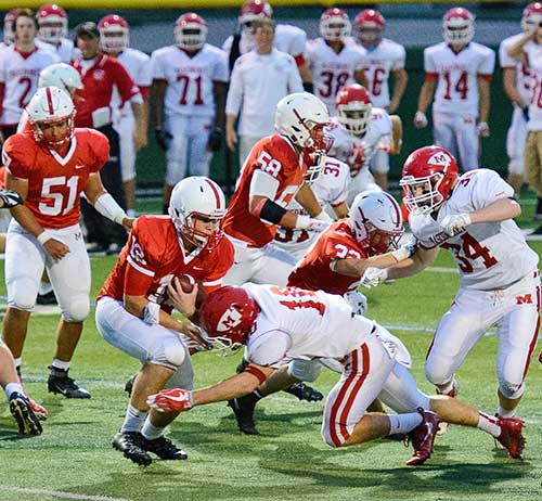 Masco began their possession with a hand off up the middle but ran smack in the wall of Melrose defensive tackle Jake Fortier for a loss. Masco found a groove and began driving after two big gains on the outside. Melrose’s Colin Kiernan and Kevin Peete caused big collisions but Masco advanced into the Raider red zone soon punch ed it up the middle for a touchdown, leaving the score at 6-6 with about ten minutes left in the second quarter. As Masco lined up for the extra point and the go ahead, Melrose’s Cameron Rosie burst through the line like a ball seeking missile and dived in front of the kick, blocking it, and keeping the score tied.