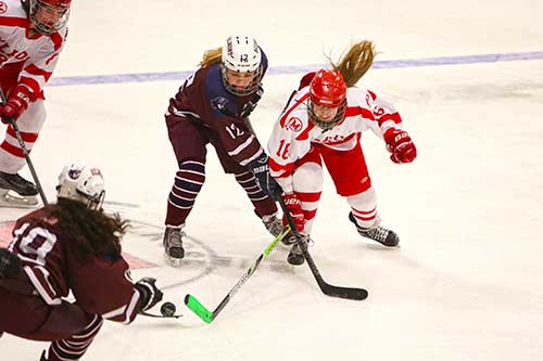 On Tuesday, January 3 Melrose rang in the new year with an impressive 5-2 win over Wilmington at Rustuccia Rink in Wilmington. Crovo led in scoring with two goals, the first assisted by Saoirse Connolly and Jill Mercer, and the second assisted by Mercer and Maggie O’Donnell. Melrose’s Courtney O’Connor at the net kept the Wildcats scoreless until the third period, when Jill Miele and Ida Bishop found the net. Crovo’s two goals game in the first and second period, while Emma Galvin Lynch added at goal at 1:20 in the second on an assist by Maggie O’Donnell and Jill Mercer. Emma Sikora made it a 4-1 game at 13:39 in the third (assisted by Linnea Kelley and Mercer) while Mercer scored her own unassisted shot, the last of the game to make it a 5-2 final.
