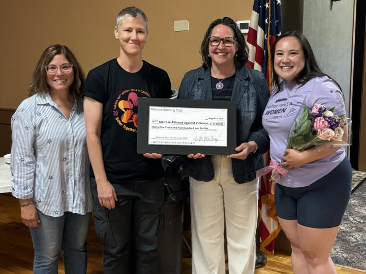 MELROSE — During a recent weekly meeting, The Melrose Running Club proudly presented Melrose Alliance Against Violence with a donation check for $31,500 from the proceeds of this year’s Melrose Run for Women. MAAV is incredibly grateful for this partnership and all monies raised go directly to support survivors of domestic violence in our community so they and their children may live lives free of violence and feel safe in their own homes. A special thank you goes to Race Director Caitlin Mogan whose tireless dedication makes this race more successful each year and to Fitzgerald Physical Therapy Associates for being the event’s title sponsor.