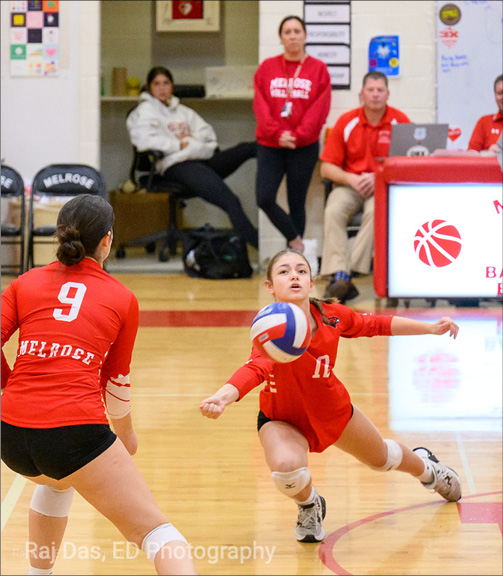 Melrose offered plenty of talent on its own with senior captain Sabine Wenzel tallying 17 kills, continuing her dominant season. Melrose’s Anna Burns also shined significantly on the line, serving a flawless 100%. The duo came in handy when Melrose took the first set, 25-22. Melrose also benefited from nice serving by Danielle DiGiorgio, who also had 11 digs in the contest. Adriana Santoriello matched those 11 digs and Alisa Dautovic had a strong 22 serve receipts in the back row. Setter Sadie Smith had 23 assists.