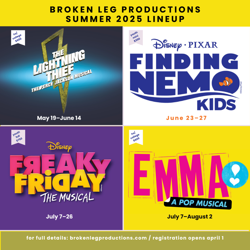 To register starting April 1 and to learn more about the shows, go to the BLP website (https://brokenlegproductions.com/summer-programs/). Questions: email (info@brokenlegproductions.com). Register by April 14 to receive a discount ($50 off one-week mini session, $100 off full sessions).