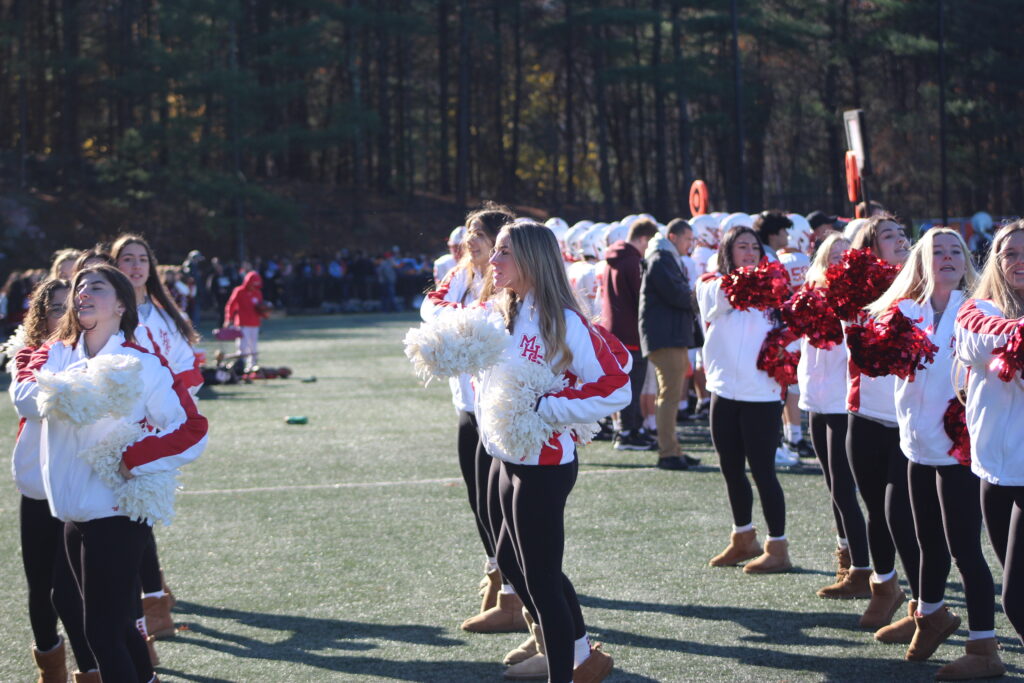 THE MHS Cheer team worked hard at the 63rd Annual Thanksgiving game at Landrigan Field in Wakefield. It was the 113th meeting between the two teams in a rivalry that dates back to 1901. (Jennifer Gentile photo)