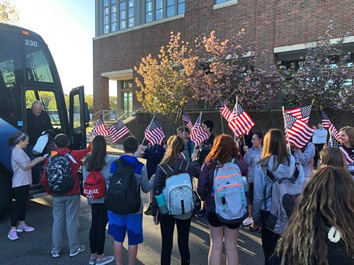 OPERATION RESILIENT arrived back in Melrose on Saturday, May 11 after a poignant, two night trip to Washington, D.C. Sponsored by the Melrose Veteran’s Memory Project, the visit included 8th grade MVMMS students and invited veterans who were honored during the trip, with a focus on Afghanistan veterans. The bus was escorted by Melrose Police and Massachusetts State Police and greeted at home with an American flag hanging from the ladder trucks of the Melrose Fire Department. The annual trip included stops at the Vietnam, Korea and WWII memorials and trips to Arlington National Cemetery and the Pentagon. (Courtesy Photo)