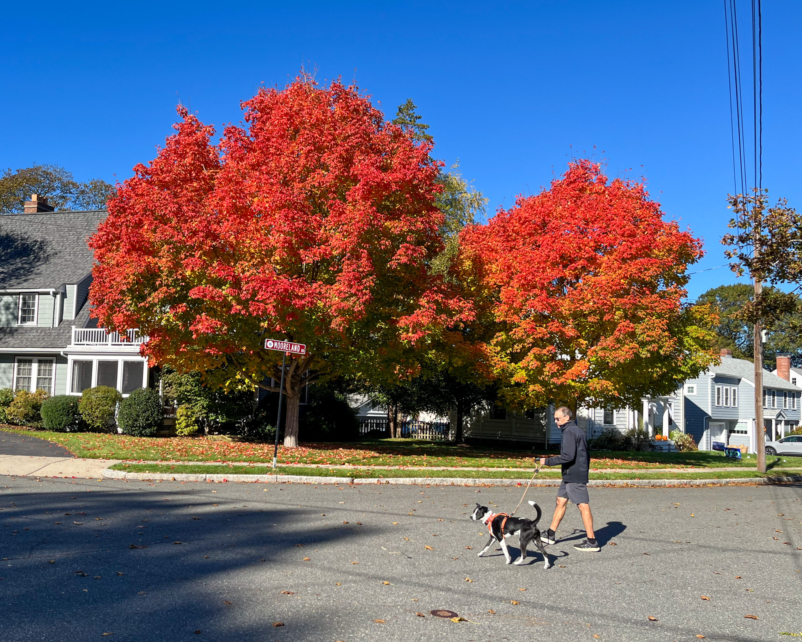 A MAN AND HIS PET take a walk as fall colors burst on Hillcrest Avenue. (Photo by Raj Das, edphotos.com)