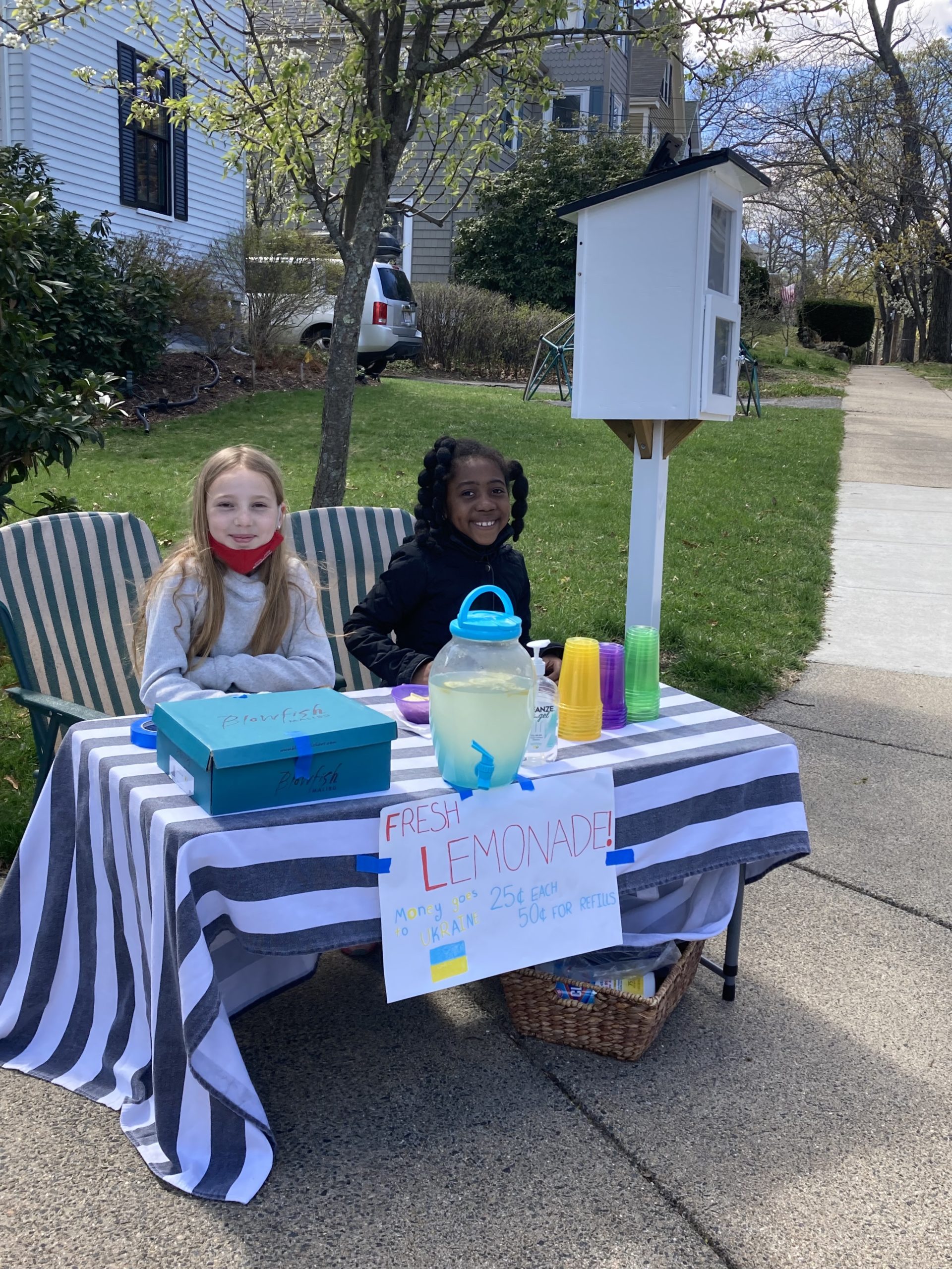 YOUNG NEIGHBORS banded together to raise funds for Ukranian war relief, selling lemonade on West Emerson street in Melrose last weekend. Their efforts over two days raised $137.00 for Condos for Kids, an organization that will provide food and medical supplies for Ukranian kids in need. Picture from left: Sarina St. Hildaire, Charlotte Mahoney, Ben Winkler, Naomi Winkler, Danny Mahoney and Patrick Mahoney. Photo at right, Naomi Winkler and Geo Jorcelin put in work on Saturday. (courtesy photos)