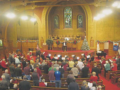 MORE THAN 100 PEOPLE attended the community-wide “Messiah Sing” Friday night, Dec. 14 at First Parish Congregational Church on Church Street. Church organist Donald Hodgkins is shown conducting the 16-piece ensemble. (Gail Lowe Photo)