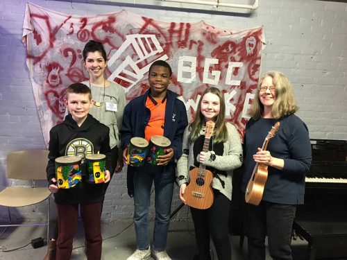 BRETON ELECTRIC donated ukuleles and bongos to the Boys & Girls Clubs of Stoneham & Wakefield music program. In the photo is the Boys & Girls Clubs of Stoneham & Wakefield music director Sarah Ellis and Breton Electric’s Wendy Dennis. (Anthony Guardia Photo)
