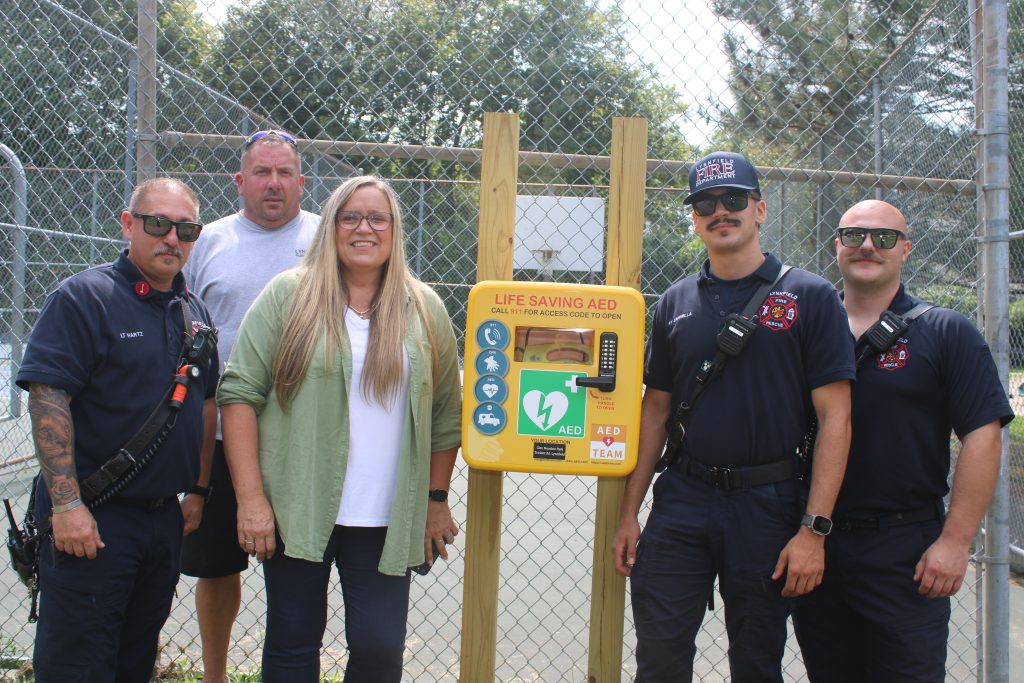 TOWN EMPLOYEES, from left, Fire Lt./Paramedic Paul Hartz, Department of Public Works Operations Superintendent Mike Nestor, Health Director Coral Hope, Firefighter/EMT Anthony Cannella and Firefighter/Paramedic Nick Holmes proudly display a new AED box installed at Glen Meadow Park. (Dan Tomasello Photo)