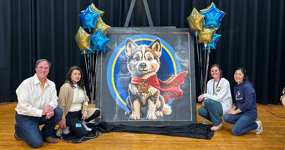 Huckleberry Hill School recently unveiled its brand new mascot, Huck the Hero, during a school-wide assembly. Huck is a replica of a husky that is made out of 40,000 non-Lego bricks.