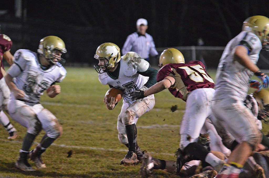 Throughout the night, the Hornets rotated carries among their four horseman: Sophomores John Merullo and Matt McCarthy and juniors David Smith and Nic O’Connell. As with most games late this season, top gains went to Smith with 238 yards on 27 carries and a touchdown including gains of 45 and 33 yards. Coaches turned to O’Connell more than in any other game this season and were not disappointed as he had his first career multi-touchdown game with two on only eight carries totaling 82 yards. McCarthy posted 67 yards on 18 yards but seemed to pay the price more than any player for each yard gained. Merullo displayed his typical eye popping cuts and moves amassing 25 yards on his nine carries.