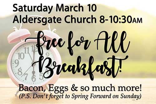 NORTH READING — The “Under Construction” free-for-all breakfast at Aldersgate United Methodist Church, 235 Park St., is Saturday, March 10, from 8-10:30 a.m.