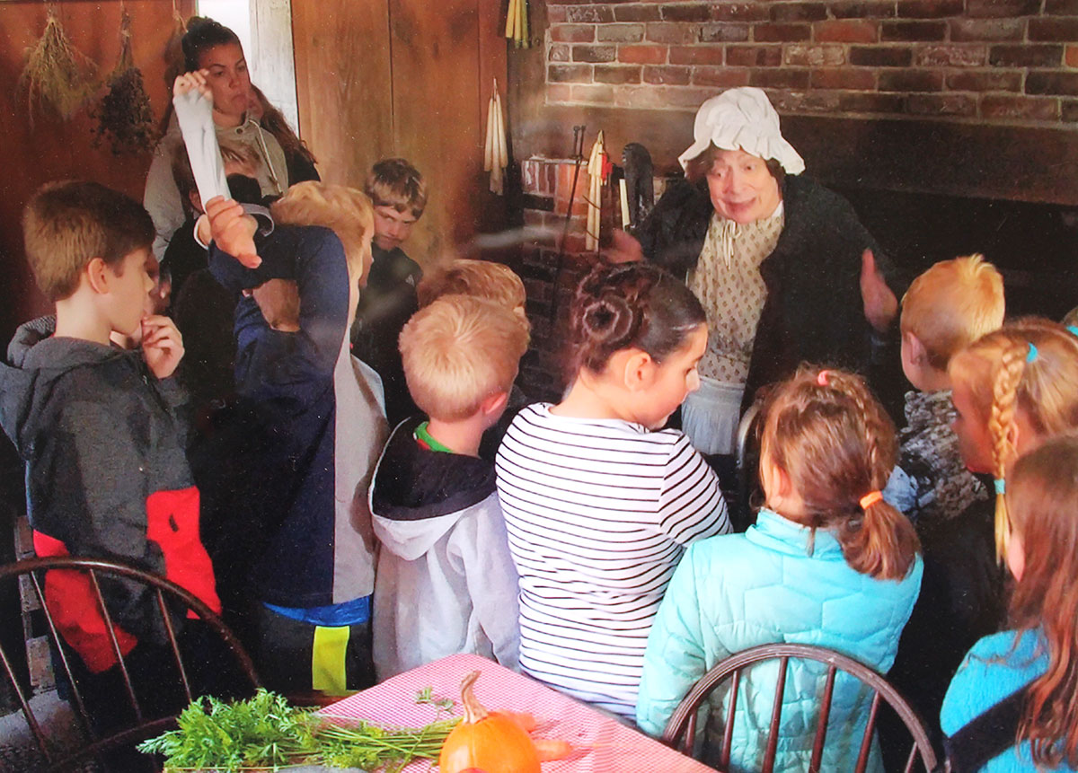 PAT ROMEO (facing camera), dressed in her Colonial-era costume, enjoyed teaching the town’s schoolchildren about Colonial life during tours she gave of the 1720 Rev. Daniel Putnam House for more than 40 years. (Courtesy Photo)