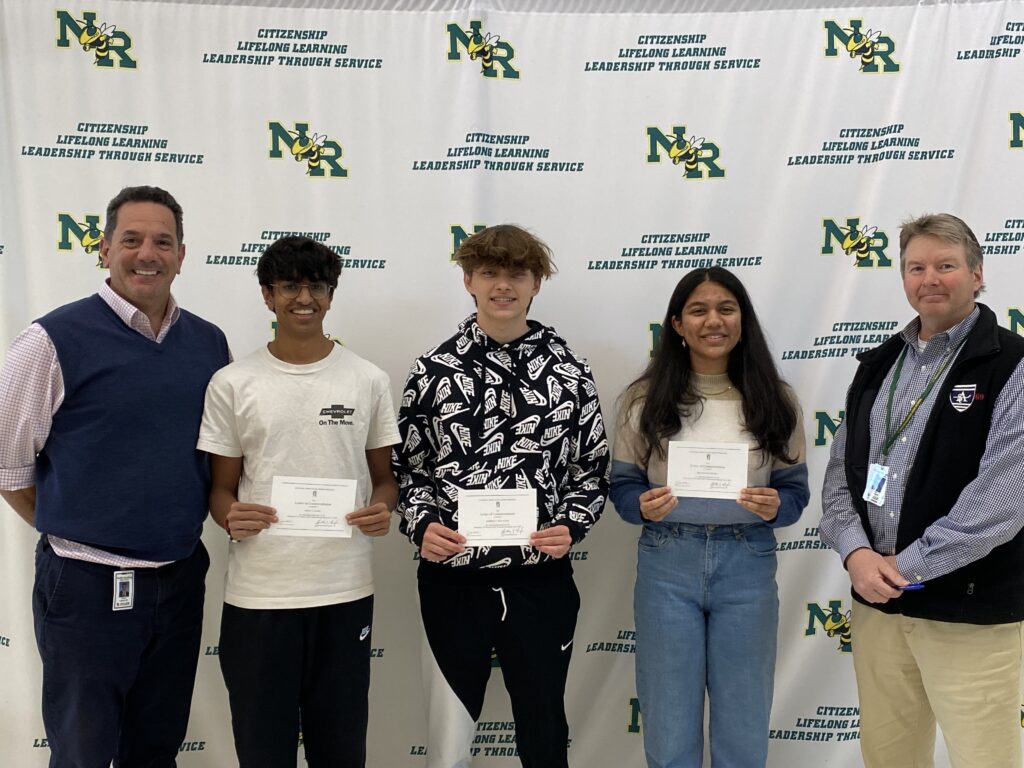 THREE NRHS seniors were recognized as Commended Students in the 2024 National Merit Scholarship competition. They are among 34,000 students nationwide to receive this honor for their outstanding potential for academic success based on the results of their Preliminary SAT/NMSQT exam scores taken last year. From left: NRHS Principal Anthony Loprete, Aiden Patel, Andrew Mountain and Bhagyavi Bandara, and Guidance Counselor John Giuliotti. See story inside this week’s paper. (Courtesy Photo)