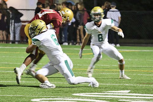 AIDAN CARUCCI makes a tackle with Cam Randazzo (8) ready to help. The Hornets beat Newburyport to improve to 4-0 on the season. (Bob Currier Photo)
