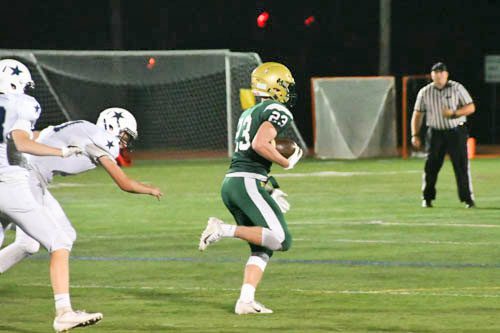 Sophomore Ryan McCullough got the start and did not disappoint. While he didn’t throw as frequently as his predecessor, he was accurate. On the third play from scrimmage, McCullough dumped a short pass over the top to Jack Keller who did the rest, racing 73-yards for a go-ahead score. Robert Tammaro’s PAT made it 7-0 for the visitors, just 45-seconds into the game.