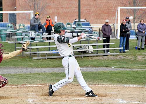 ALEX D’AMBROSIO connects on a three-run home run during North Reading’s 11-4 win over Newburyport on April 17. D’Ambrosio’s excellent week at the dish continued against Manchester- Essex when he hit another homer in the top of the 8th to give NR an 11-10 lead which they would hold for another win. (John Friberg Photo)