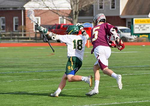 MIKE SHERIDAN (18) had a terrific week to help the Hornets continue their winning streak and clinch a spot in the state tournament. Sheridan had eight points against Triton, eight goals against Lynnfield and six goals against Nantucket. (John Friberg Photo)