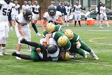 North Reading squandered an insurance opportunity early in the second half. Starting from their own 45, the Hornets marched rapidly into the red zone and at one point, stood on the 1-yard-line with a 2nd-and-goal. Demetri added a 22-yard rush but was hurt on the play and didn’t return to action. Later in the series, QB Brian Heffernan found Ryan Kavanaugh for 26, most of it run after the catch. But Lynnfield weathered the storm, denying further advance. North Reading turned to Tammaro for a 22-yard field goal try but the kick was a low, line drive blocked at the line by Joseph Contardo.
