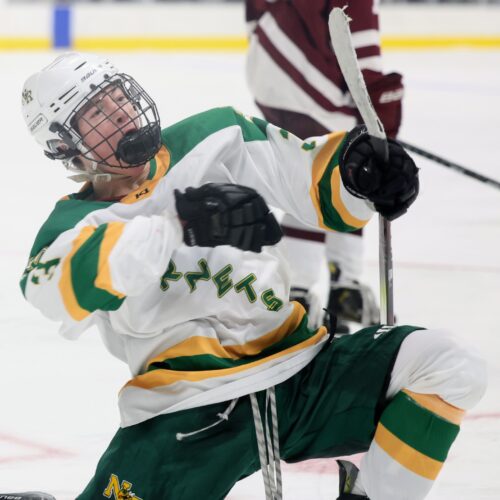 “Honestly, we couldn’t get it going in the first two periods,” said North Reading Coach Brian McAuliffe, who added a nice touch by starting his five seniors as part of the senior night tribute. “We had a number of scoring opportunities but we weren’t finding the back of the net. But in that third period, from the very first shift, you could almost feel the momentum swing.”