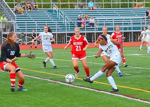 In the second half, NRHS would add two more goals. Goal number one came when Vesey picked up a loose ball at the top of box and slid the ball past the Amesbury keeper. Moments later Nadeau found Kaithamattam open and Jerlin buried the shot to open up a 3-0 lead. The Indians would add a late goal but the Hornets went on to victory.