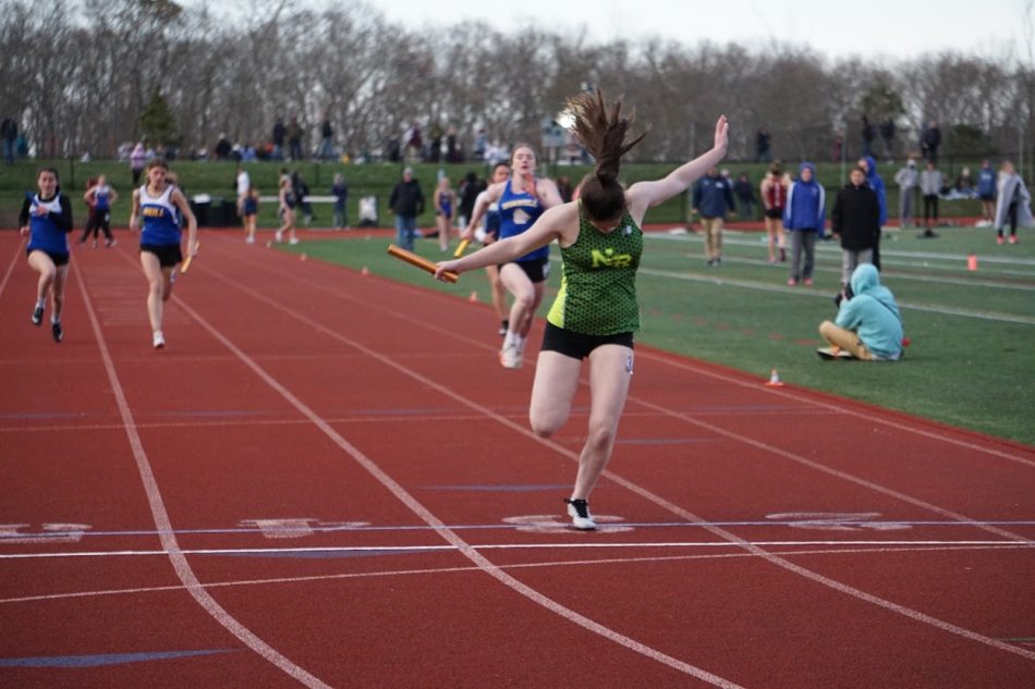 SAMANTHA PATCH hustles through the finish line to seal NR’s first place finish in the 4×100 relay on Friday at Sandwich High. Patch also helped the 4×200 relay take 2nd. (NRHS Track Photo)