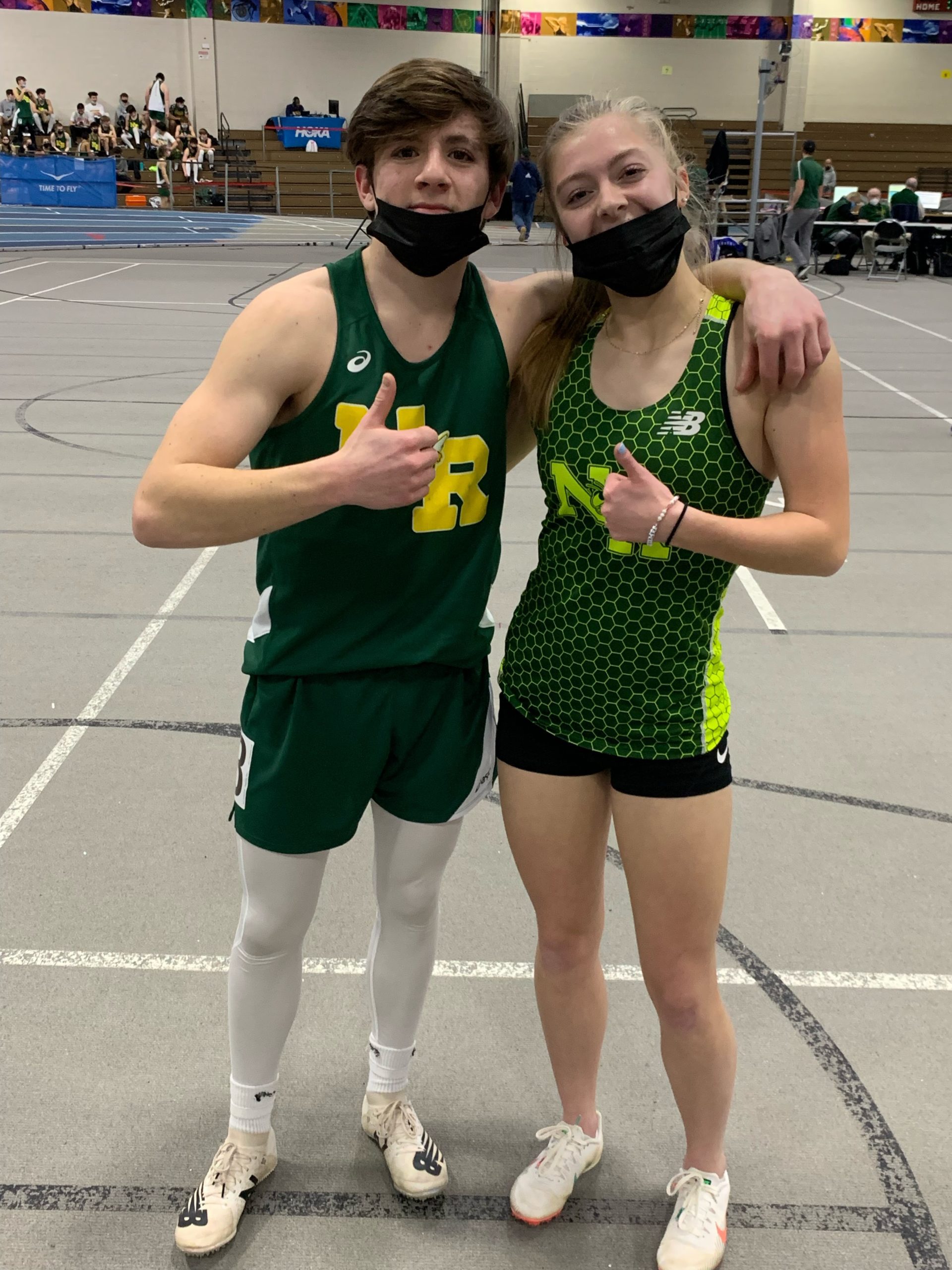 THE HORNETS had both the girls’ and boys’ 55 meter CAL champion. Pictured is boys’ 55m champ Alex Carpenter and girls’ 55m champ Ava McIntyre. (NRHS Track Photo)