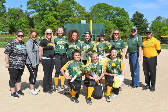THE NRHS softball seniors were honored before their win over Pentucket last week. Pictured with their coaches are the seniors, in the front row from left, Jessica Ferrazzani, Emma Valade, and Caroline Belinowiz. The seniors In the back row from left is Hailey Sanphy, Leah Ferrazzani, Natalie Dos Santos, Cassandra Pascucci, and team manager Kiley Martel. (John Friberg Photo)