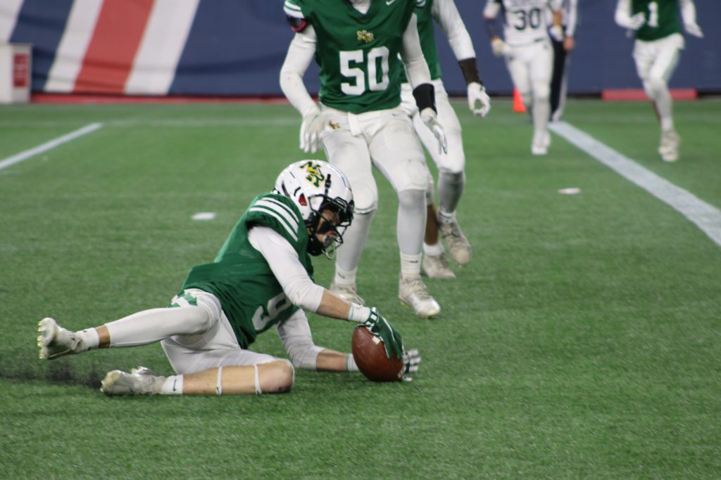 The North Reading faithful, huddled against the cold in the Gillette stands, were rewarded for their patience as the fourth quarter got underway. Starting deep on their own 14, the Hornets began to steadily chip away at the long field ahead. A determined Carucci was accurately slinging short sideline throws, completing a flawless 8-of-8 to Batten, Rubino and McCullough. In interest of clock preservation, the receivers would secure the catch and quickly step out of bounds.