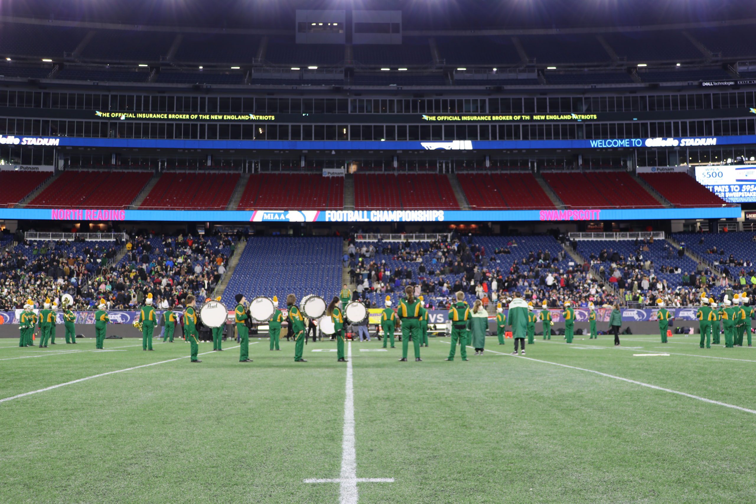 THE NRHS football team lines up for the Div. 5 Super Bowl at Gillette Stadium while the Hornet Marching Band plays the National Anthem as pictured on the big screen. (Dan Pawlowski Photo)