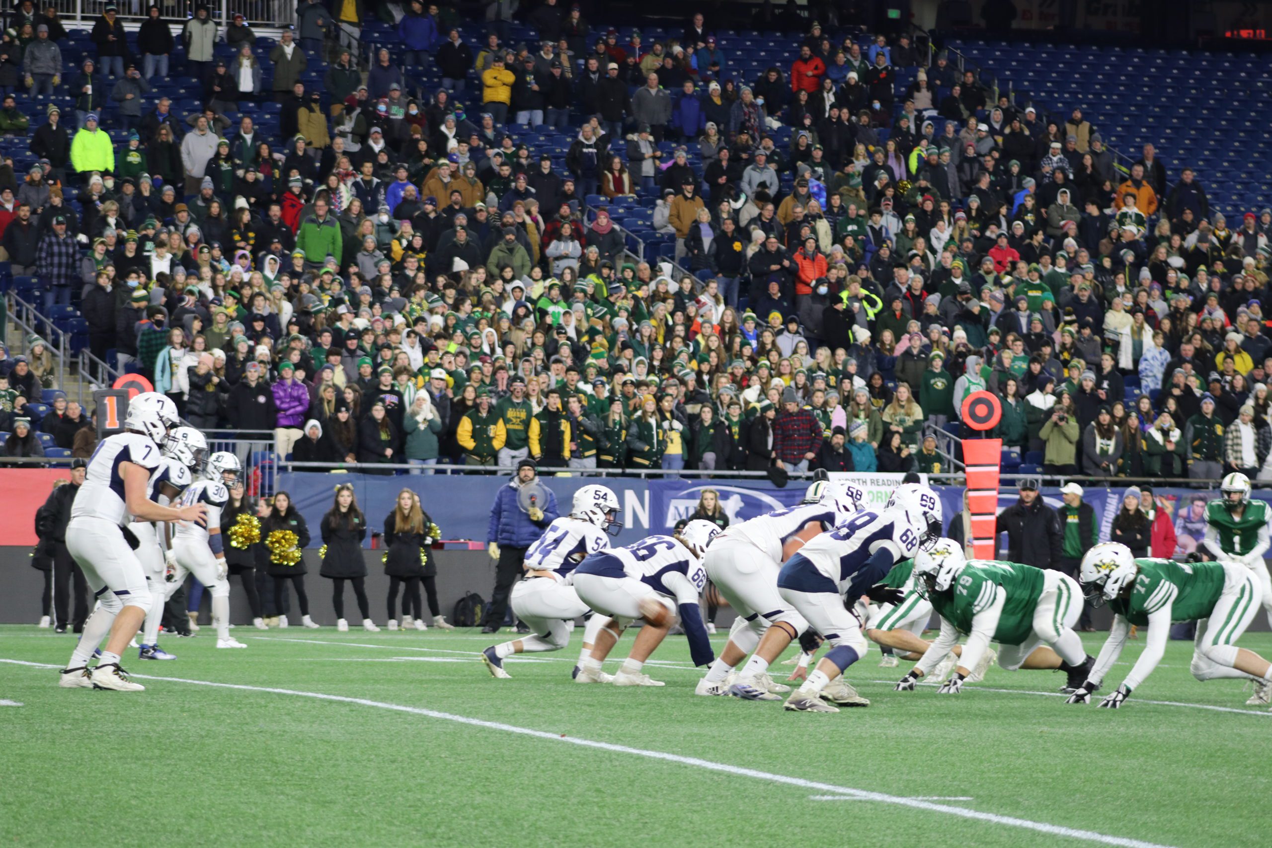Amid the spectacle of a high school Super Bowl, which included a fire apparatus siren sendoff as the team busses departed North Reading and obviously, the opportunity to play football on the same big stage previously occupied by so many New England Patriots dignitaries, the Hornets discovered very early how difficult the task ahead would be. On the first play of the game, for instance, sophomore sensation Will Batten, who scored twenty-five rushing TDs this season, was driven back for a 3-yard loss. As the running game failed to materialize, the Hornets resorted to short passing.