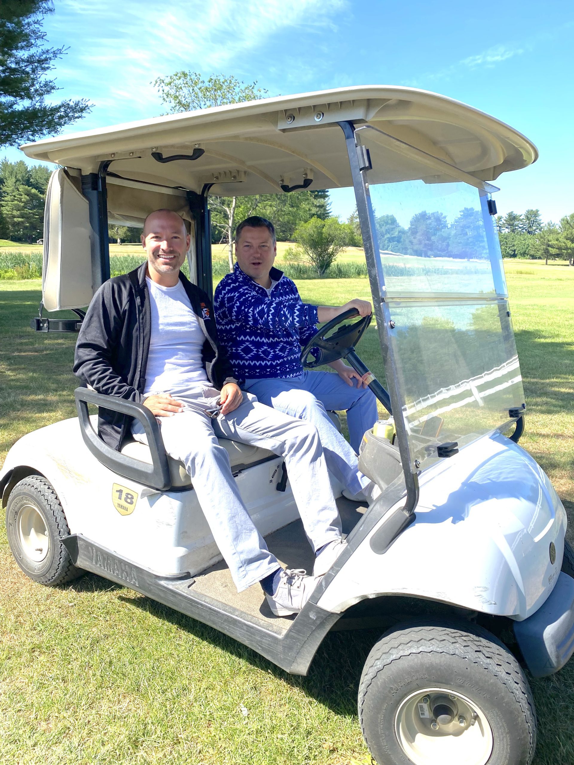 NEW HORSESHOE GRILLE owners Noah Goldstein (left) and Ryan Cox enjoyed hitting the links during the 37th annual Jimmy Fund Golf Tournament. The tournament raised over $45,000 for the betterment of cancer patients at the Dana-Farber Cancer Institute. (Kathi Lee Photo)