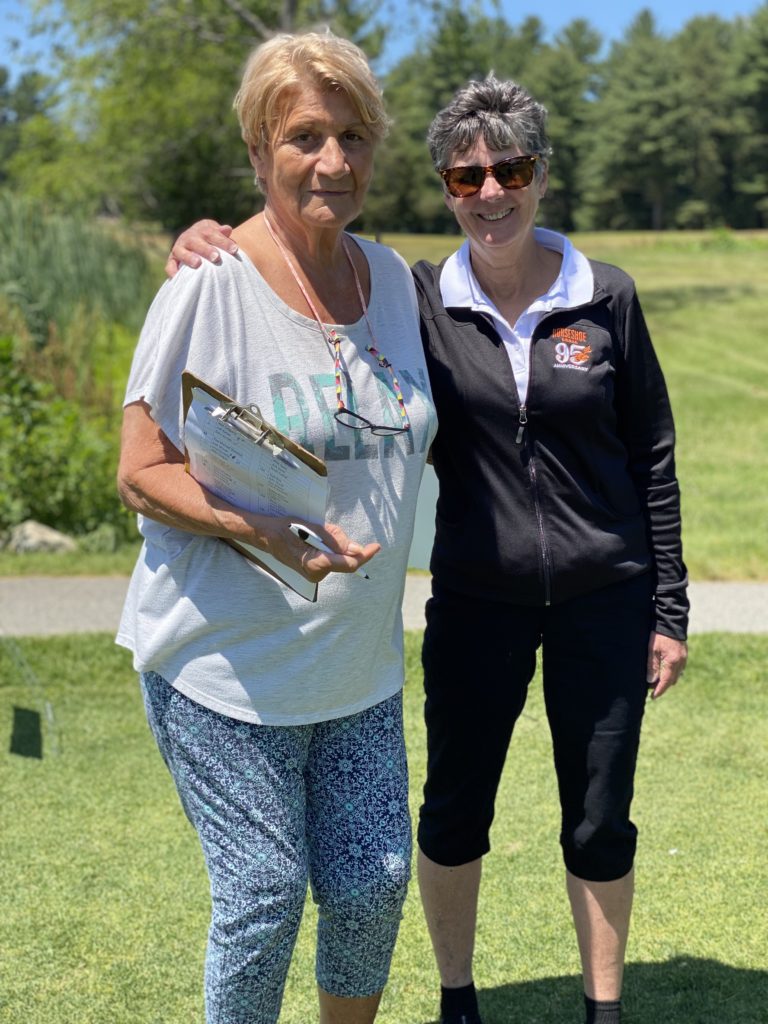 DEDICATED VOLUNTEERS Donna Anderson (left) and Penni Mullarky sold mulligan chances to raise money during the 37th annual Horseshoe Grille Jimmy Fund Golf Tournament. (Kathi Lee Photo)