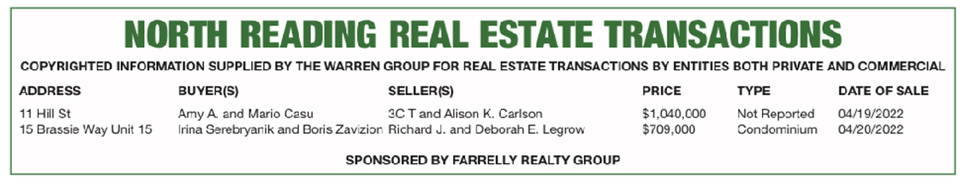 North Reading Real Estate Transactions published May 12, 2022