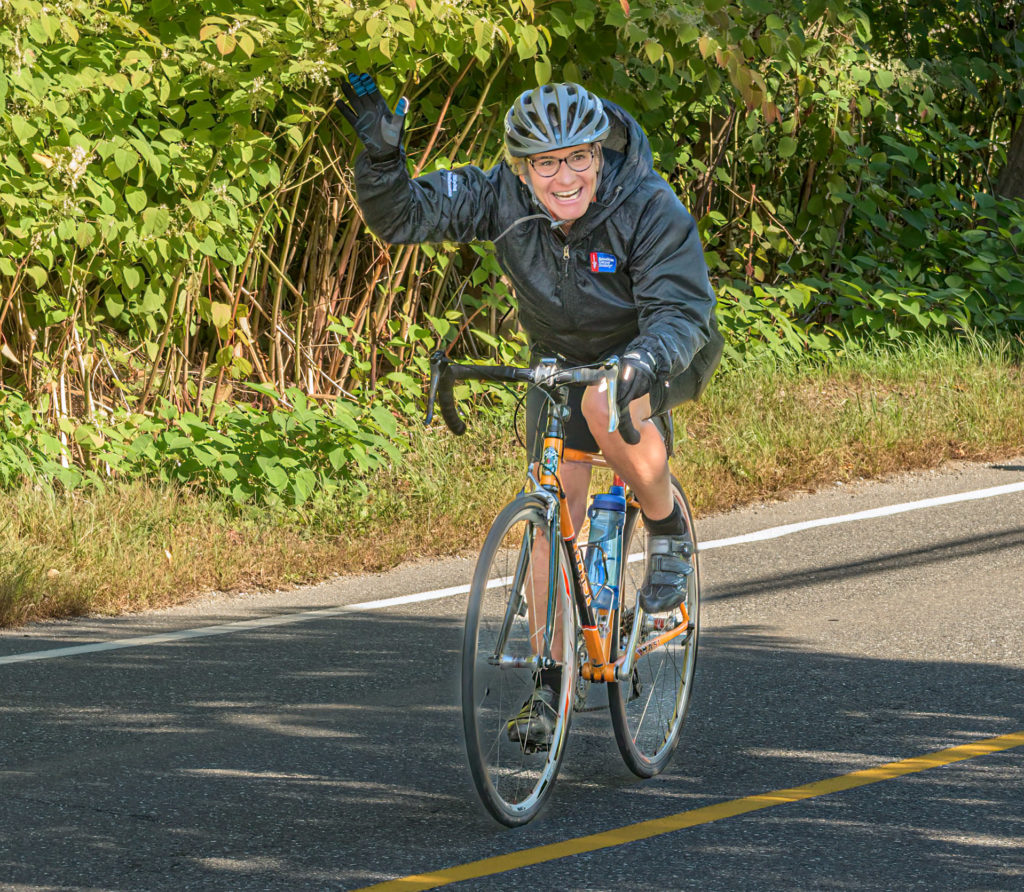 LOUISE SANTOSUOSSO smiles triumphantly while riding in a past Bicycles Battling Cancer event to benefit the American Cancer Society. A longtime participant in the event each September, this year she has surpassed $500,000 in cumulative giving to honor the memory of her parents. Read more inside today’s Transcript. (Courtesy Photo)