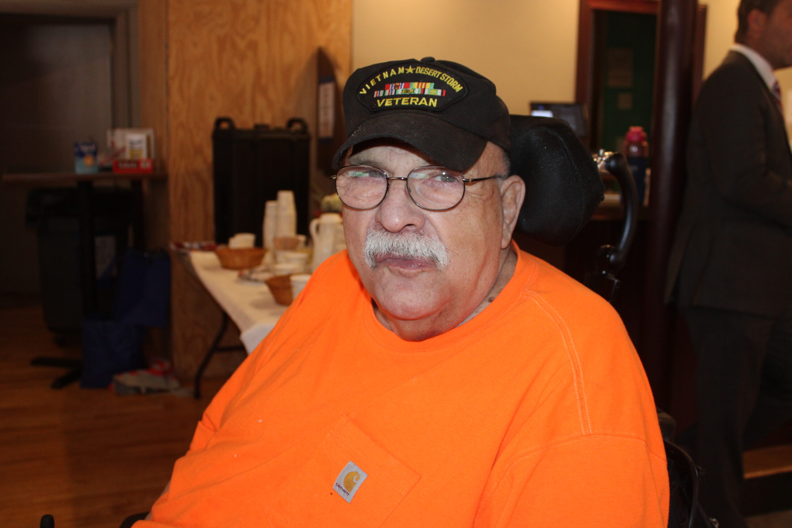 PAT RUGGIERO, a 30-year veteran of the U.S. Army who served from Vietnam to Desert Storm, enjoyed the camaraderie during the Veterans Breakfast at the Moose. (Maureen Doherty Photo)
