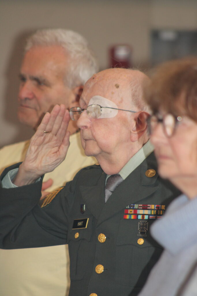 KOREAN WAR veteran David Hart, who served in the U.S. Army, salutes during the National Anthem at the Veterans Breakfast. (Maureen Doherty Photo)