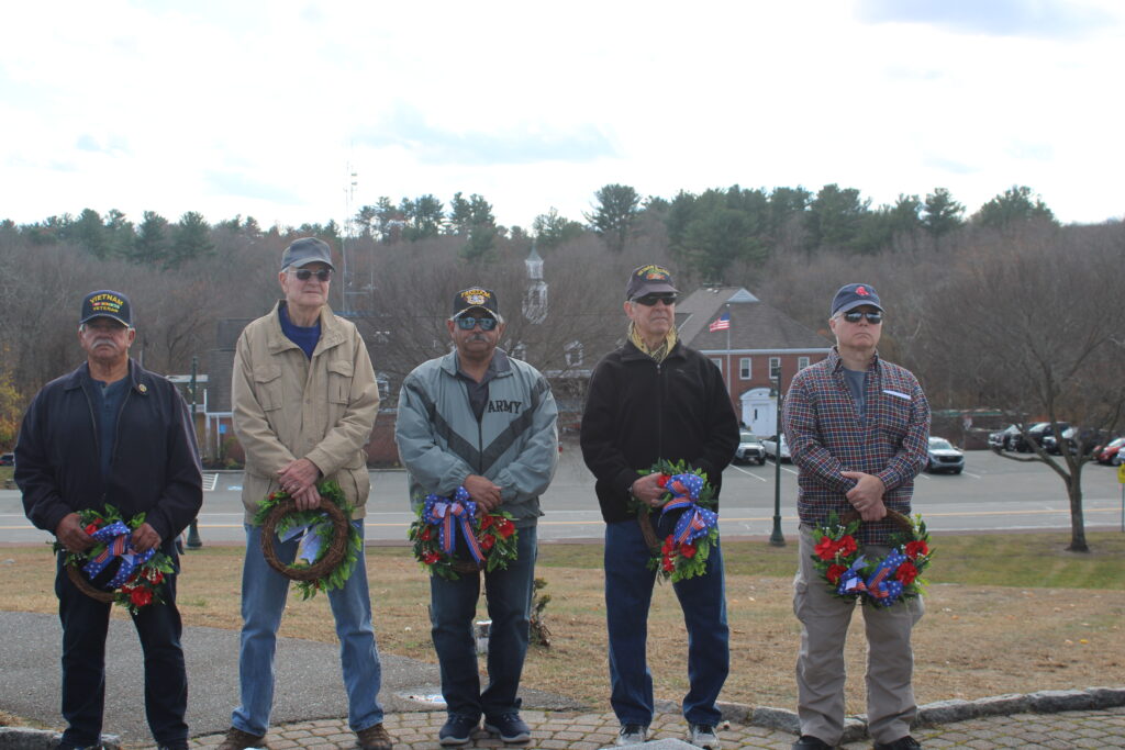 PLACING OF THE WREATHS on war memorials by veterans (l-r): Gerard Pelletier (Navy, Vietnam), Joe Malek (Army: Vietnam), Tomas Sanchez (Navy: Vietnam; and Army National Guard), Ken Ravioli (Army: Vietnam), and Dan Mahoney (Army: Persian Gulf 1 & 2, Bosnia, Afghanistan). (Maureen Doherty Photo)