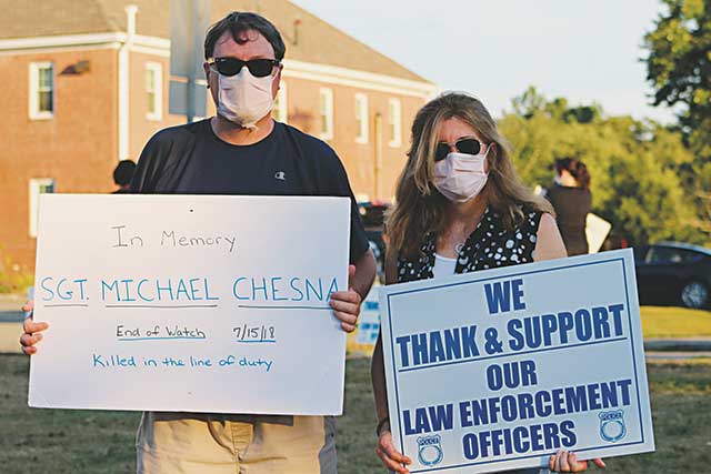 ANDY AND LESLIE Schultz show their support for local police as well as the memory of slain Weymouth Sgt. Michael Chesna who was killed in the line of duty on July 15, 2018. (Maureen Doherty Photo)
