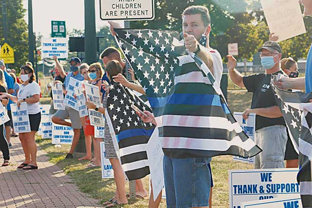 Starting at 5:30 p.m., participants waved to the passing cars, motorcyclists and bicyclists while holding American Flags, thin blue line flags, homemade signs and dozens of lawn signs that read: “We Support & Thank our Law Enforcement Officers.”
