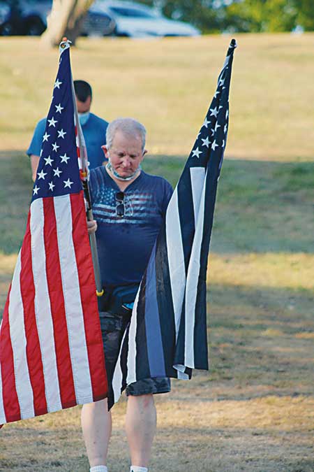 WELL OVER 100 supporters lined the sidewalk along the length of the Town Common, across the street from the Police/Fire Station, for a 90-minute non-political rally in support of all police officers August 12. A group of about 12 counter-protesters shared a section of the sidewalk near Haverhill Street. (Maureen Doherty Photo)